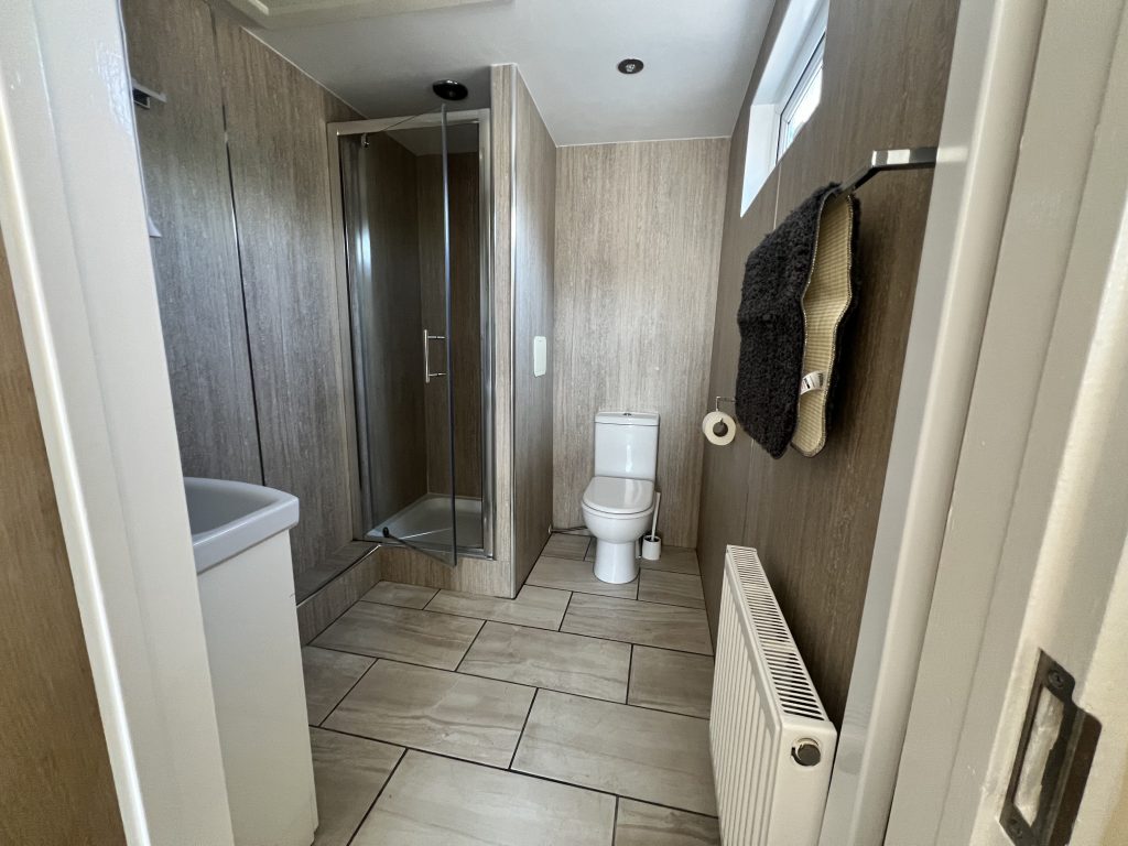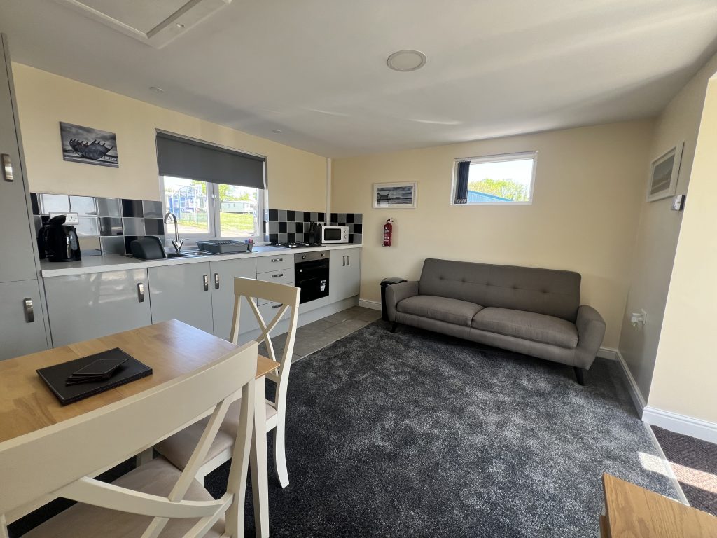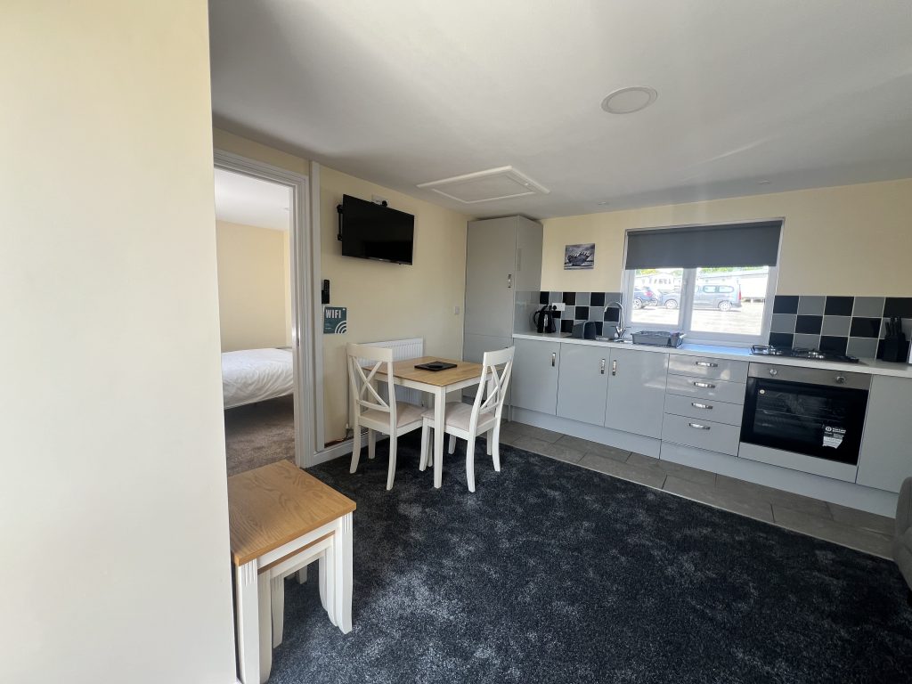 The open-plan lounge, kitchen, and dining area create a warm, inviting atmosphere for unwinding after a day of exploring. The cozy bedroom features a comfortable double bed, ensuring you enjoy a restful night’s sleep, and the modern bathroom with an enclosed shower unit.