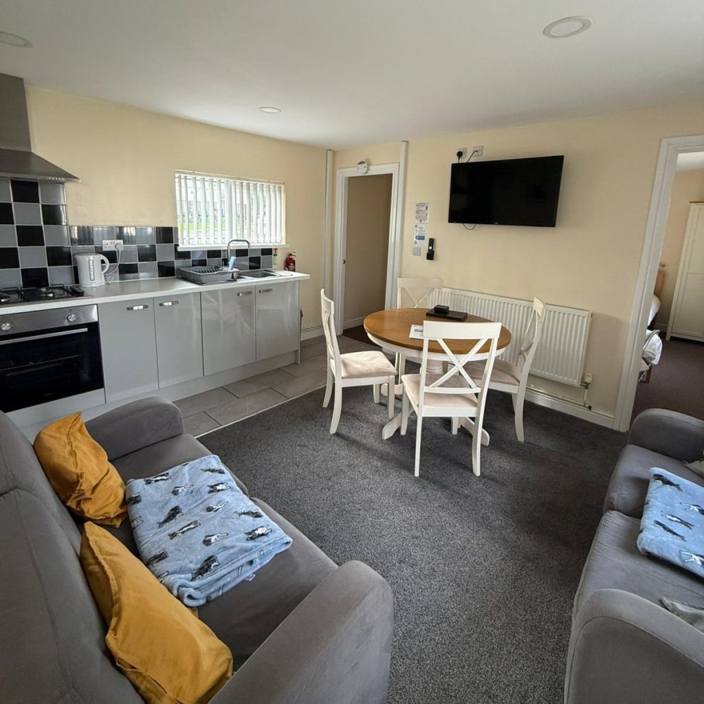 Inside, the chalet offers a cozy and spacious open-plan lounge, fully equipped kitchen, and dining area, perfect for relaxing and spending time together.